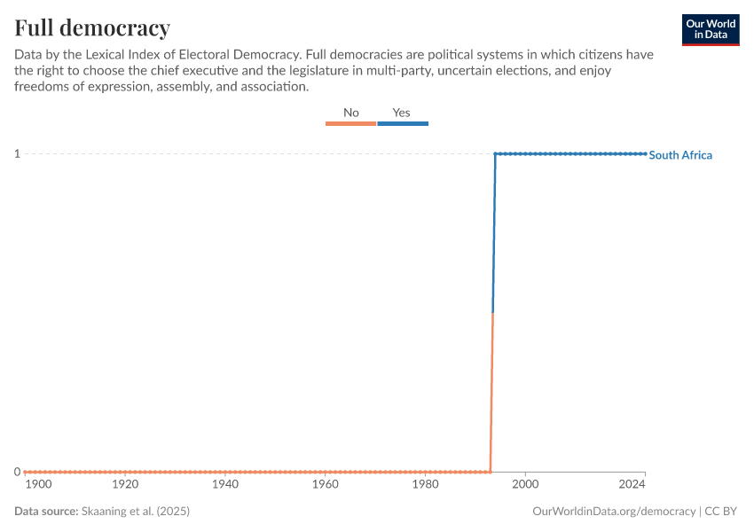 “Data Page: Full democracy”, part of the following publication: Bastian Herre, Lucas Rodés-Guirao, and Esteban Ortiz-Ospina (2013) - “Democracy”. Data adapted from Skaaning et al.. Retrieved from https://archive.ourworldindata.org/20250909-093708/grapher/full-democracy-lexical.html [online resource] (archived on September 9, 2025).