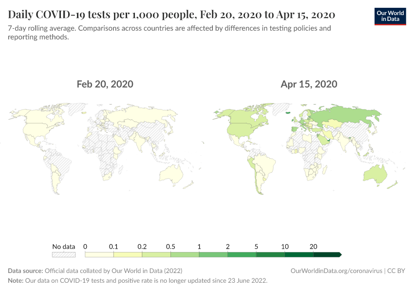Official data collated by Our World in Data (2022) – with major processing by Our World in Data. “Daily COVID-19 tests per 1,000 people” [dataset]. Official data collated by Our World in Data, “COVID-19, testing” [original data]. Retrieved December 15, 2025 from https://archive.ourworldindata.org/20250909-093708/grapher/daily-tests-per-thousand-people-smoothed-7-day.html (archived on September 9, 2025).