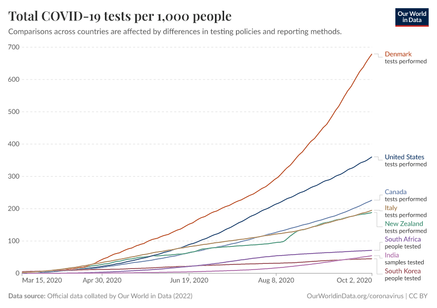 Comparisons across countries are affected by differences in testing policies and reporting methods.