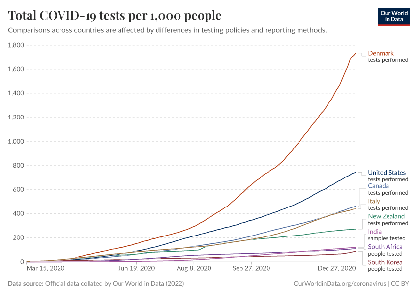 Official data collated by Our World in Data (2022) – with major processing by Our World in Data. “Total COVID-19 tests per 1,000 people” [dataset]. Official data collated by Our World in Data, “COVID-19, testing” [original data]. Retrieved December 16, 2025 from https://archive.ourworldindata.org/20250909-093708/grapher/full-list-cumulative-total-tests-per-thousand.html (archived on September 9, 2025).