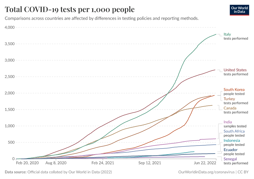 Official data collated by Our World in Data (2022) – with major processing by Our World in Data. “Total COVID-19 tests per 1,000 people” [dataset]. Official data collated by Our World in Data, “COVID-19, testing” [original data]. Retrieved December 6, 2025 from https://archive.ourworldindata.org/20250909-093708/grapher/full-list-cumulative-total-tests-per-thousand.html (archived on September 9, 2025).