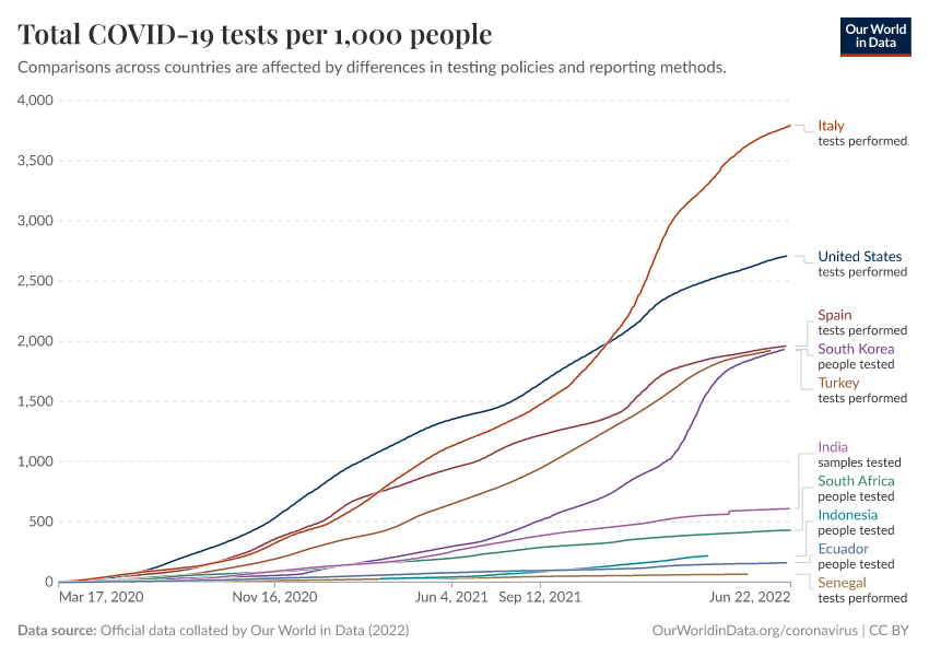 Official data collated by Our World in Data (2022) – with major processing by Our World in Data. “Total COVID-19 tests per 1,000 people” [dataset]. Official data collated by Our World in Data, “COVID-19, testing” [original data]. Retrieved December 7, 2025 from https://archive.ourworldindata.org/20250909-093708/grapher/full-list-cumulative-total-tests-per-thousand.html (archived on September 9, 2025).