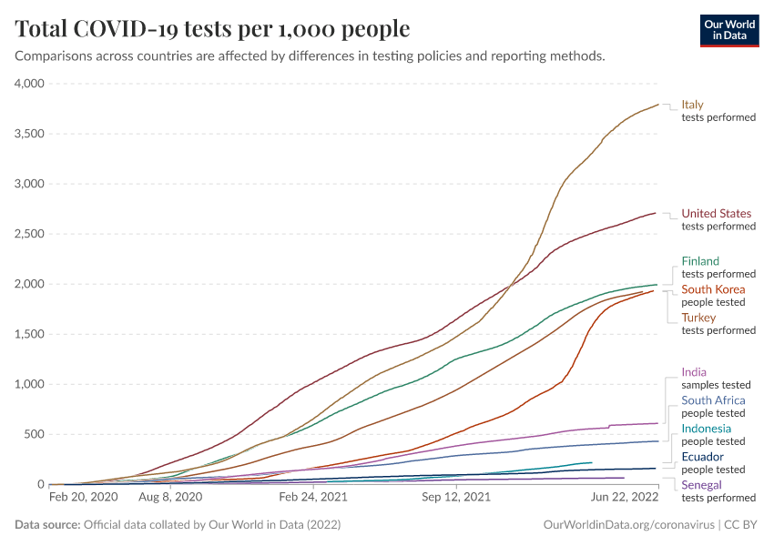Official data collated by Our World in Data (2022) – with major processing by Our World in Data. “Total COVID-19 tests per 1,000 people” [dataset]. Official data collated by Our World in Data, “COVID-19, testing” [original data]. Retrieved December 25, 2025 from https://archive.ourworldindata.org/20250909-093708/grapher/full-list-cumulative-total-tests-per-thousand.html (archived on September 9, 2025).