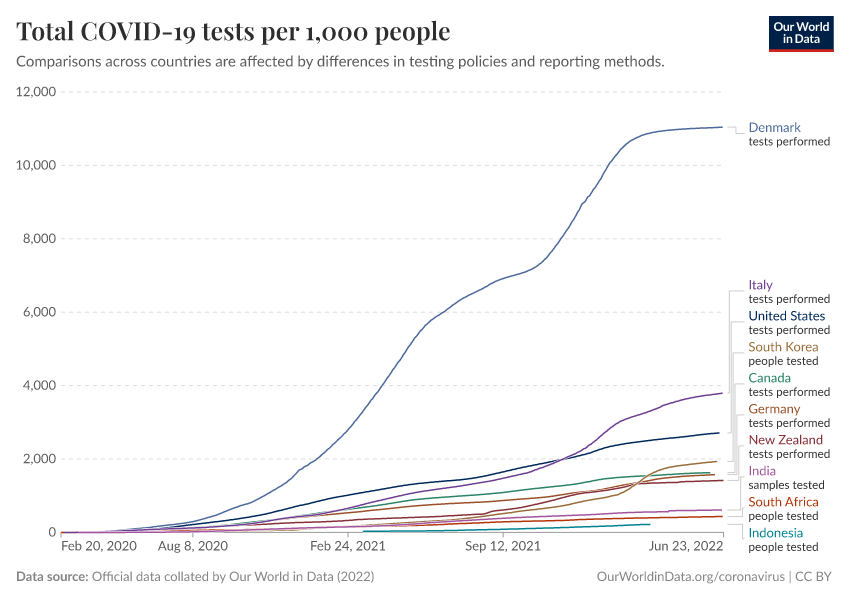 Official data collated by Our World in Data (2022) – with major processing by Our World in Data. “Total COVID-19 tests per 1,000 people” [dataset]. Official data collated by Our World in Data, “COVID-19, testing” [original data]. Retrieved December 24, 2025 from https://archive.ourworldindata.org/20250909-093708/grapher/full-list-cumulative-total-tests-per-thousand.html (archived on September 9, 2025).