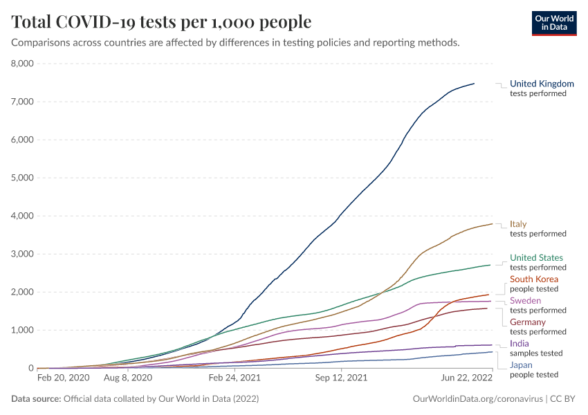 Official data collated by Our World in Data (2022) – with major processing by Our World in Data. “Total COVID-19 tests per 1,000 people” [dataset]. Official data collated by Our World in Data, “COVID-19, testing” [original data]. Retrieved January 15, 2026 from https://archive.ourworldindata.org/20250909-093708/grapher/full-list-cumulative-total-tests-per-thousand.html (archived on September 9, 2025).