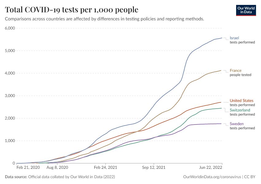 Official data collated by Our World in Data (2022) – with major processing by Our World in Data. “Total COVID-19 tests per 1,000 people” [dataset]. Official data collated by Our World in Data, “COVID-19, testing” [original data]. Retrieved January 16, 2026 from https://archive.ourworldindata.org/20250909-093708/grapher/full-list-cumulative-total-tests-per-thousand.html (archived on September 9, 2025).