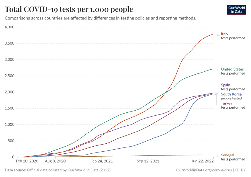 Official data collated by Our World in Data (2022) – with major processing by Our World in Data. “Total COVID-19 tests per 1,000 people” [dataset]. Official data collated by Our World in Data, “COVID-19, testing” [original data]. Retrieved December 10, 2025 from https://archive.ourworldindata.org/20250909-093708/grapher/full-list-cumulative-total-tests-per-thousand.html (archived on September 9, 2025).
