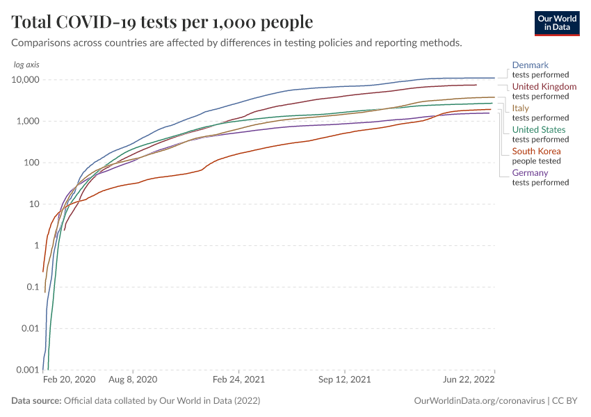 Official data collated by Our World in Data (2022) – with major processing by Our World in Data. “Total COVID-19 tests per 1,000 people” [dataset]. Official data collated by Our World in Data, “COVID-19, testing” [original data]. Retrieved April 20, 2026 from https://archive.ourworldindata.org/20260304-094028/grapher/full-list-cumulative-total-tests-per-thousand.html (archived on March 4, 2026).Download