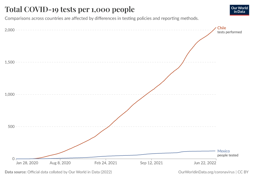 Comparisons across countries are affected by differences in testing policies and reporting methods.