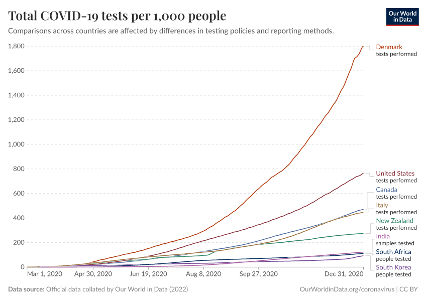 Official data collated by Our World in Data (2022) – with major processing by Our World in Data. “Total COVID-19 tests per 1,000 people” [dataset]. Official data collated by Our World in Data, “COVID-19, testing” [original data]. Retrieved December 14, 2025 from https://archive.ourworldindata.org/20250909-093708/grapher/full-list-cumulative-total-tests-per-thousand.html (archived on September 9, 2025).