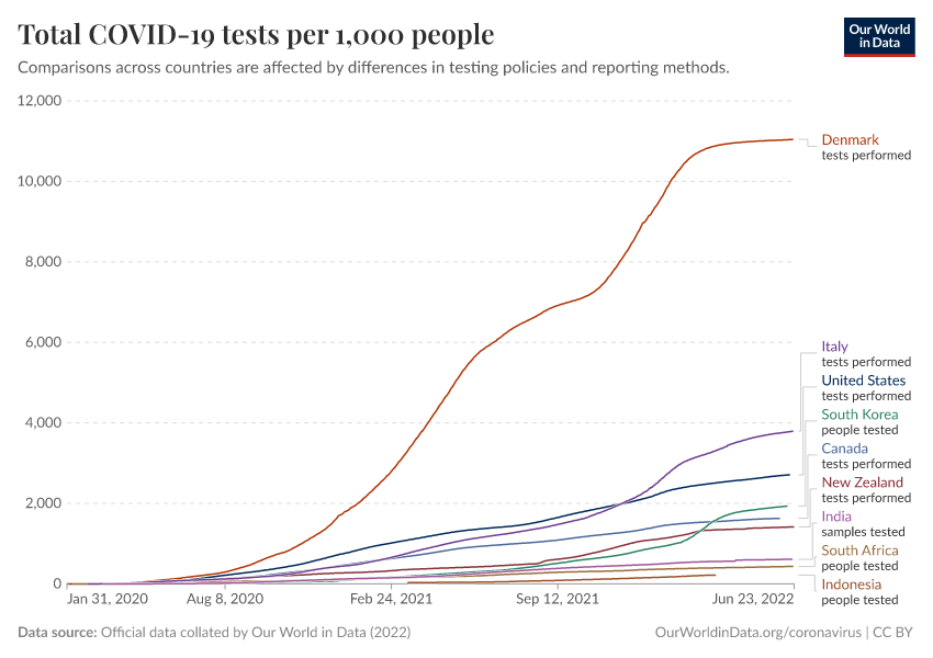 Official data collated by Our World in Data (2022) – with major processing by Our World in Data. “Total COVID-19 tests per 1,000 people” [dataset]. Official data collated by Our World in Data, “COVID-19, testing” [original data]. Retrieved December 14, 2025 from https://archive.ourworldindata.org/20250909-093708/grapher/full-list-cumulative-total-tests-per-thousand.html (archived on September 9, 2025).