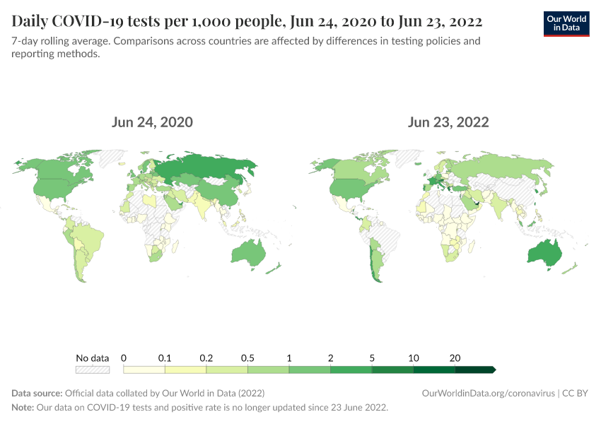 Official data collated by Our World in Data (2022) – with major processing by Our World in Data. “Daily COVID-19 tests per 1,000 people” [dataset]. Official data collated by Our World in Data, “COVID-19, testing” [original data]. Retrieved December 14, 2025 from https://archive.ourworldindata.org/20250909-093708/grapher/daily-tests-per-thousand-people-smoothed-7-day.html (archived on September 9, 2025).
