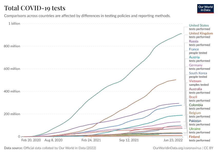 “Data Page: Total COVID-19 tests”, part of the following publication: Edouard Mathieu, Hannah Ritchie, Lucas Rodés-Guirao, Cameron Appel, Daniel Gavrilov, Charlie Giattino, Joe Hasell, Bobbie Macdonald, Saloni Dattani, Diana Beltekian, Esteban Ortiz-Ospina, and Max Roser (2020) - “COVID-19 Pandemic”. Data adapted from Official data collated by Our World in Data. Retrieved from https://archive.ourworldindata.org/20250909-093708/grapher/full-list-total-tests-for-covid-19.html [online resource] (archived on September 9, 2025).