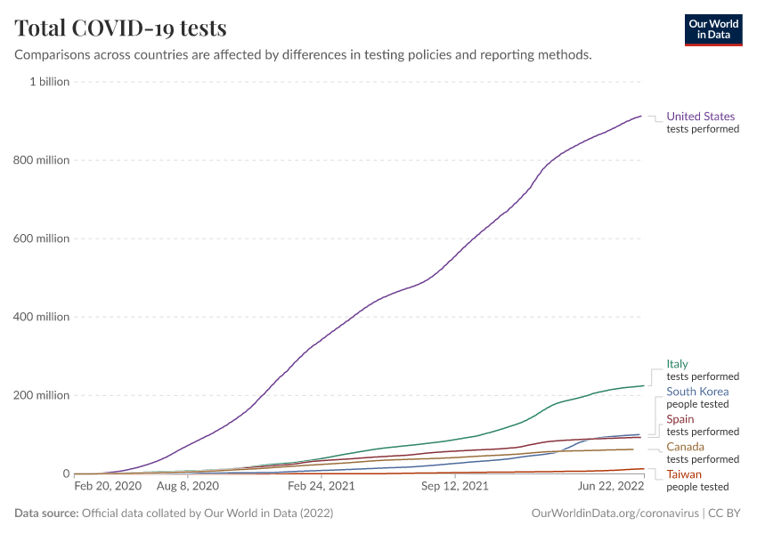 “Data Page: Total COVID-19 tests”, part of the following publication: Edouard Mathieu, Hannah Ritchie, Lucas Rodés-Guirao, Cameron Appel, Daniel Gavrilov, Charlie Giattino, Joe Hasell, Bobbie Macdonald, Saloni Dattani, Diana Beltekian, Esteban Ortiz-Ospina, and Max Roser (2020) - “COVID-19 Pandemic”. Data adapted from Official data collated by Our World in Data. Retrieved from https://archive.ourworldindata.org/20250909-093708/grapher/full-list-total-tests-for-covid-19.html [online resource] (archived on September 9, 2025).