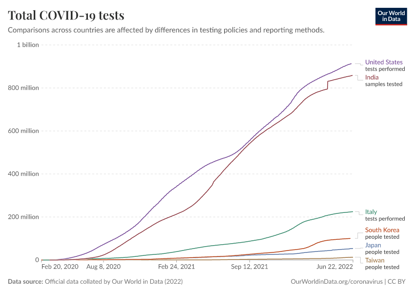 Official data collated by Our World in Data (2022) – with major processing by Our World in Data. “Total COVID-19 tests” [dataset]. Official data collated by Our World in Data, “COVID-19, testing” [original data]. Retrieved April 2, 2026 from https://archive.ourworldindata.org/20260304-094028/grapher/full-list-total-tests-for-covid-19.html (archived on March 4, 2026).Download