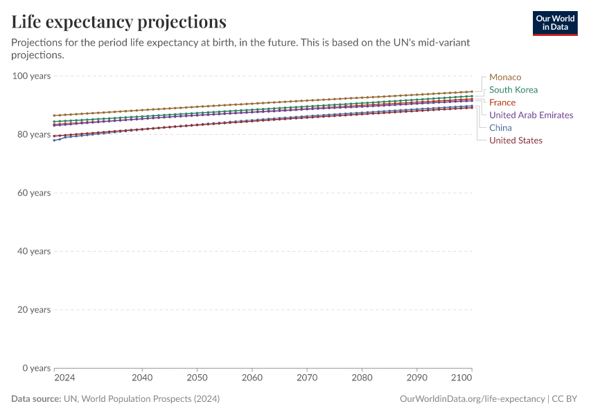 “Data Page: Life Expectancy, age 0, medium projection”. Our World in Data (2025). Data adapted from United Nations. Retrieved from https://archive.ourworldindata.org/20250909-093708/grapher/future-life-expectancy-projections.html [online resource] (archived on September 9, 2025).How to cite this data