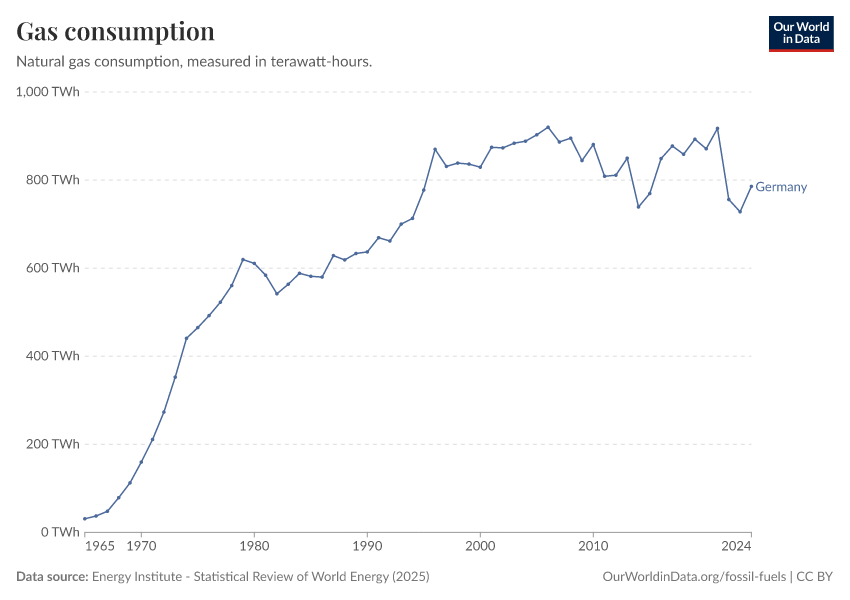 Energy Institute - Statistical Review of World Energy (2025) – with major processing by Our World in Data. “Gas consumption” [dataset]. Energy Institute, “Statistical Review of World Energy” [original data]. Retrieved January 16, 2026 from https://archive.ourworldindata.org/20250909-093708/grapher/gas-consumption-by-country.html (archived on September 9, 2025).
