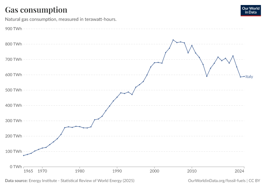 Energy Institute - Statistical Review of World Energy (2025) – with major processing by Our World in Data. “Gas consumption” [dataset]. Energy Institute, “Statistical Review of World Energy” [original data]. Retrieved April 15, 2026 from https://archive.ourworldindata.org/20260304-094028/grapher/gas-consumption-by-country.html (archived on March 4, 2026).Download
