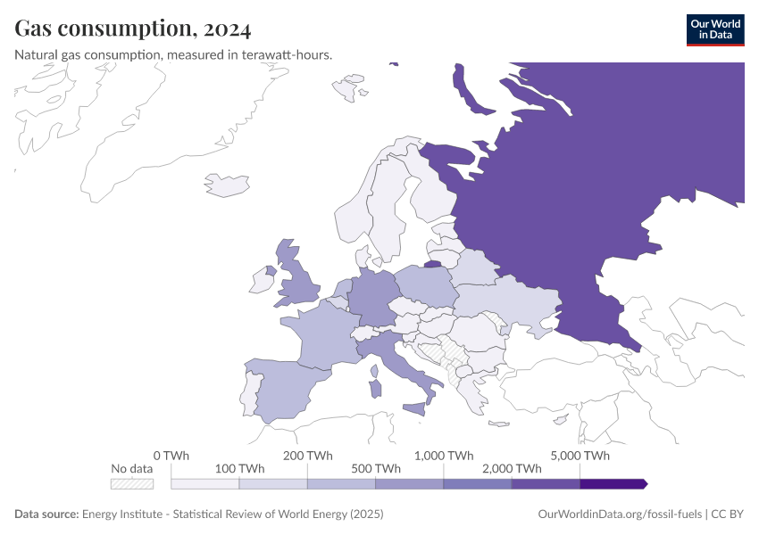 Energy Institute - Statistical Review of World Energy (2025) – with major processing by Our World in Data. “Gas consumption” [dataset]. Energy Institute, “Statistical Review of World Energy” [original data]. Retrieved January 15, 2026 from https://archive.ourworldindata.org/20250909-093708/grapher/gas-consumption-by-country.html (archived on September 9, 2025).