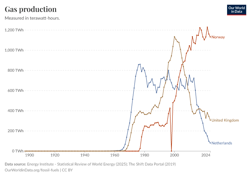 “Data Page: Gas production”, part of the following publication: Hannah Ritchie, Pablo Rosado, and Max Roser (2023) - “Energy”. Data adapted from Energy Institute, The Shift Data Portal. Retrieved from https://archive.ourworldindata.org/20250909-093708/grapher/gas-production-by-country.html [online resource] (archived on September 9, 2025).How to cite this data