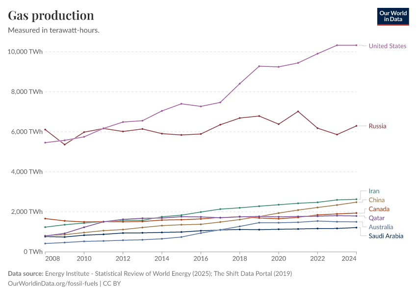 “Data Page: Gas production”, part of the following publication: Hannah Ritchie, Pablo Rosado, and Max Roser (2023) - “Energy”. Data adapted from Energy Institute, The Shift Data Portal. Retrieved from https://archive.ourworldindata.org/20250909-093708/grapher/gas-production-by-country.html [online resource] (archived on September 9, 2025).