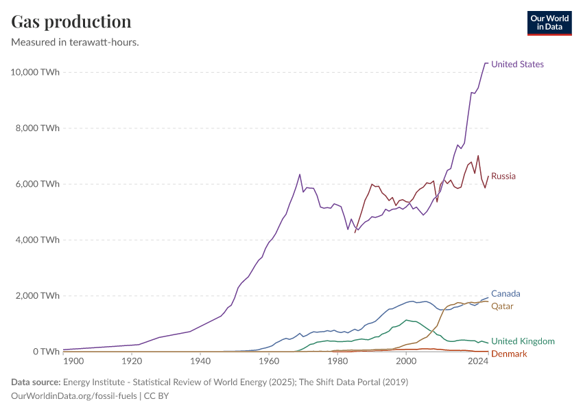 “Data Page: Gas production”, part of the following publication: Hannah Ritchie, Pablo Rosado, and Max Roser (2023) - “Energy”. Data adapted from Energy Institute, The Shift Data Portal. Retrieved from https://archive.ourworldindata.org/20250909-093708/grapher/gas-production-by-country.html [online resource] (archived on September 9, 2025).How to cite this data