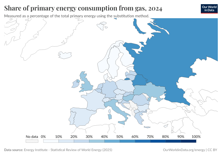Energy Institute - Statistical Review of World Energy (2025) – with major processing by Our World in Data. “Share of primary energy consumption that comes from gas – Using the substitution method” [dataset]. Energy Institute, “Statistical Review of World Energy” [original data]. Retrieved December 14, 2025 from https://archive.ourworldindata.org/20250909-093708/grapher/gas-share-energy.html (archived on September 9, 2025).