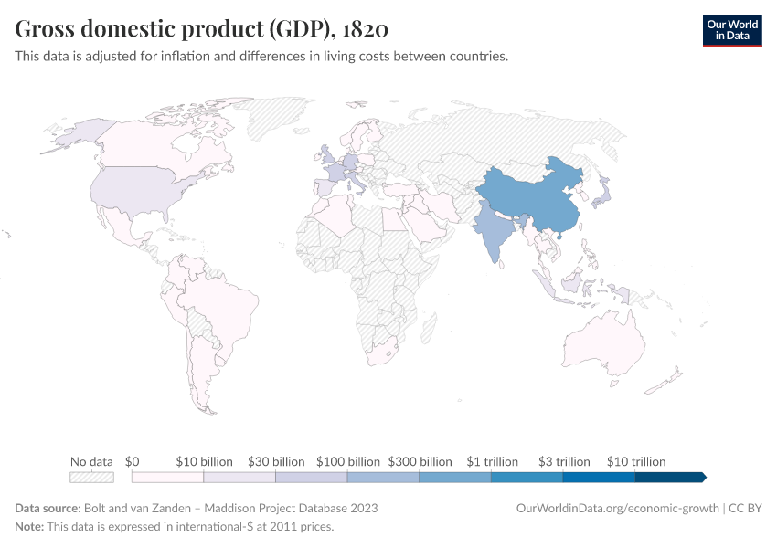 “Data Page: Gross domestic product (GDP)”, part of the following publication: Max Roser, Bertha Rohenkohl, Pablo Arriagada, Joe Hasell, Hannah Ritchie, and Esteban Ortiz-Ospina (2023) - “Economic Growth”. Data adapted from Bolt and van Zanden. Retrieved from https://archive.ourworldindata.org/20251111-144738/grapher/gdp-maddison-project-database.html [online resource] (archived on November 11, 2025).How to cite this data