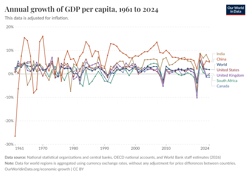 “Data Page: Annual growth of GDP per capita”, part of the following publication: Max Roser, Bertha Rohenkohl, Pablo Arriagada, Joe Hasell, Hannah Ritchie, and Esteban Ortiz-Ospina (2023) - “Economic Growth”. Data adapted from National statistical organizations and central banks, OECD national accounts, and World Bank staff estimates. Retrieved from https://archive.ourworldindata.org/20260304-094028/grapher/gdp-per-capita-growth.html [online resource] (archived on March 4, 2026).How to cite this data