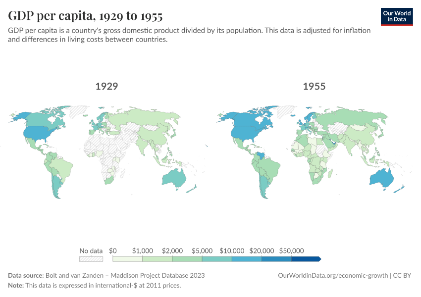 “Data Page: GDP per capita”, part of the following publication: Max Roser, Bertha Rohenkohl, Pablo Arriagada, Joe Hasell, Hannah Ritchie, and Esteban Ortiz-Ospina (2023) - “Economic Growth”. Data adapted from Bolt and van Zanden. Retrieved from https://archive.ourworldindata.org/20260304-094028/grapher/gdp-per-capita-maddison-project-database.html [online resource] (archived on March 4, 2026).How to cite this data