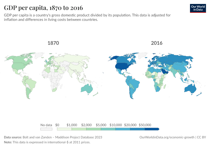 “Data Page: GDP per capita”, part of the following publication: Max Roser, Bertha Rohenkohl, Pablo Arriagada, Joe Hasell, Hannah Ritchie, and Esteban Ortiz-Ospina (2023) - “Economic Growth”. Data adapted from Bolt and van Zanden. Retrieved from https://archive.ourworldindata.org/20251111-144738/grapher/gdp-per-capita-maddison-project-database.html [online resource] (archived on November 11, 2025).