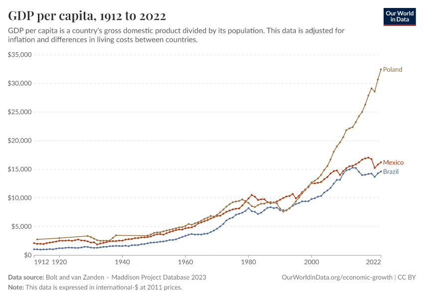 “Data Page: GDP per capita”, part of the following publication: Max Roser, Bertha Rohenkohl, Pablo Arriagada, Joe Hasell, Hannah Ritchie, and Esteban Ortiz-Ospina (2023) - “Economic Growth”. Data adapted from Bolt and van Zanden. Retrieved from https://archive.ourworldindata.org/20251111-144738/grapher/gdp-per-capita-maddison-project-database.html [online resource] (archived on November 11, 2025).How to cite this data