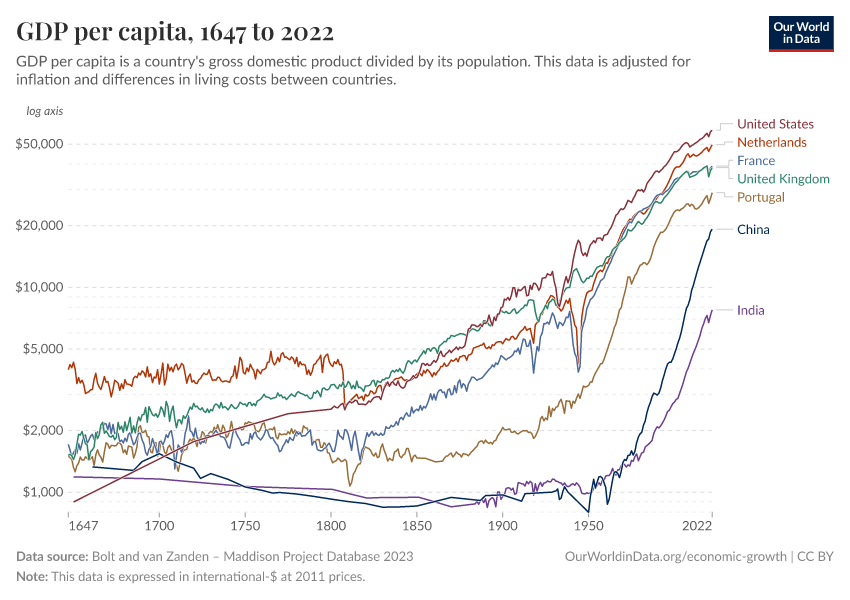 Bolt and van Zanden – Maddison Project Database 2023 – with minor processing by Our World in Data. “GDP per capita – Maddison Project Database – Long-run data in constant international-$” [dataset]. Bolt and van Zanden, “Maddison Project Database 2023” [original data]. Retrieved November 17, 2025 from https://archive.ourworldindata.org/20251111-144738/grapher/gdp-per-capita-maddison-project-database.html (archived on November 11, 2025).