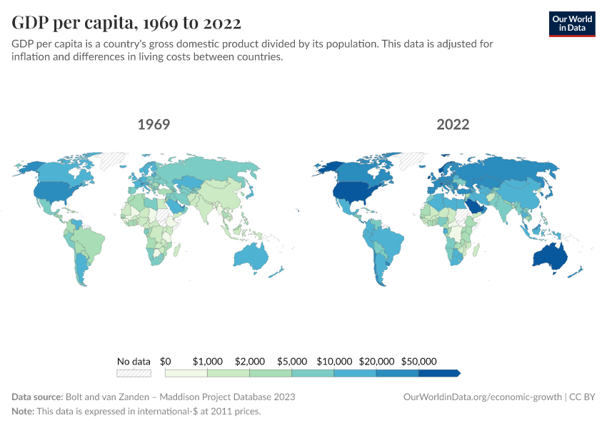 “Data Page: GDP per capita”, part of the following publication: Max Roser, Bertha Rohenkohl, Pablo Arriagada, Joe Hasell, Hannah Ritchie, and Esteban Ortiz-Ospina (2023) - “Economic Growth”. Data adapted from Bolt and van Zanden. Retrieved from https://archive.ourworldindata.org/20251111-144738/grapher/gdp-per-capita-maddison-project-database.html [online resource] (archived on November 11, 2025).How to cite this data