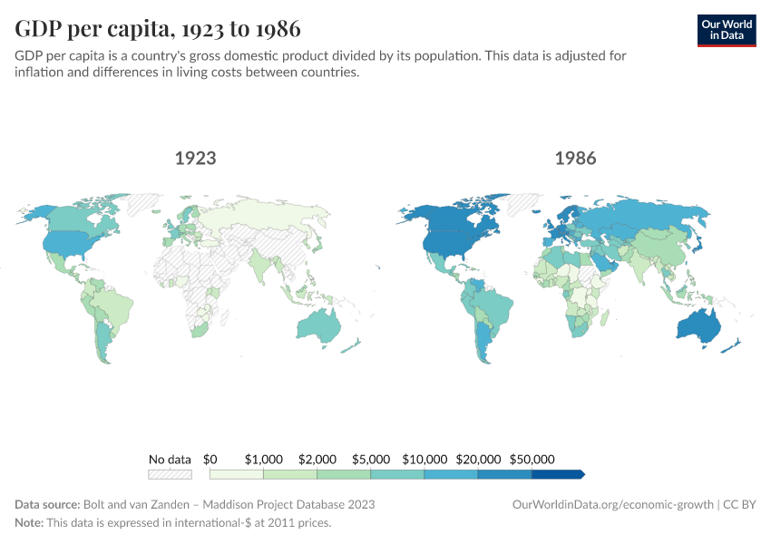 “Data Page: GDP per capita”, part of the following publication: Max Roser, Bertha Rohenkohl, Pablo Arriagada, Joe Hasell, Hannah Ritchie, and Esteban Ortiz-Ospina (2023) - “Economic Growth”. Data adapted from Bolt and van Zanden. Retrieved from https://archive.ourworldindata.org/20251111-144738/grapher/gdp-per-capita-maddison-project-database.html [online resource] (archived on November 11, 2025).How to cite this data