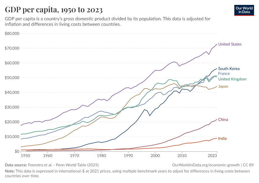 Feenstra et al. - Penn World Table (2025) – with major processing by Our World in Data. “GDP per capita – Penn World Table – In constant international-$” [dataset]. Feenstra et al., “Penn World Table 11.0” [original data]. Retrieved January 8, 2026 from https://archive.ourworldindata.org/20251013-111729/grapher/gdp-per-capita-penn-world-table.html (archived on October 13, 2025).