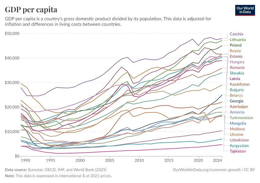 “Data Page: GDP per capita”, part of the following publication: Max Roser, Bertha Rohenkohl, Pablo Arriagada, Joe Hasell, Hannah Ritchie, and Esteban Ortiz-Ospina (2023) - “Economic Growth”. Data adapted from Eurostat, OECD, IMF, and World Bank. Retrieved from https://archive.ourworldindata.org/20251209-133038/grapher/gdp-per-capita-worldbank.html [online resource] (archived on December 9, 2025).How to cite this data