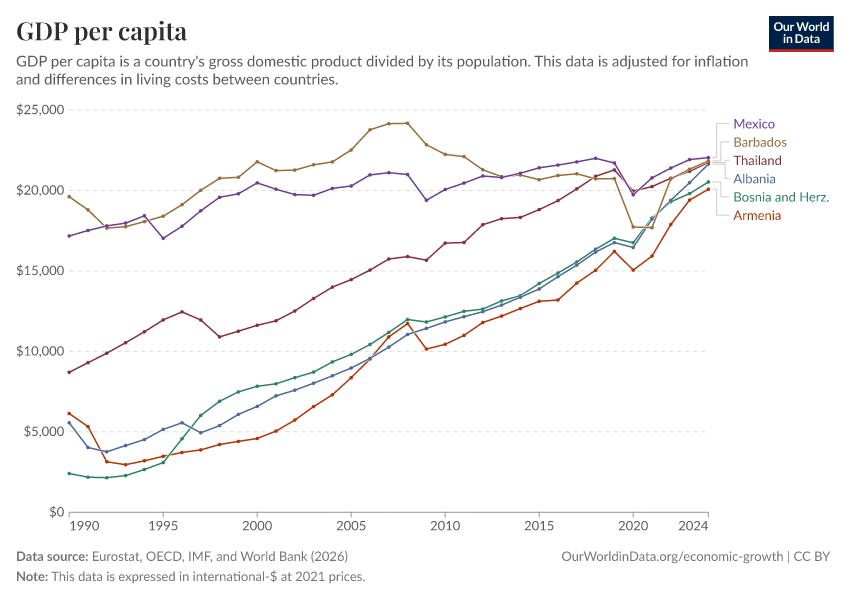 “Data Page: GDP per capita”, part of the following publication: Max Roser, Bertha Rohenkohl, Pablo Arriagada, Joe Hasell, Hannah Ritchie, and Esteban Ortiz-Ospina (2023) - “Economic Growth”. Data adapted from Eurostat, OECD, IMF, and World Bank. Retrieved from https://archive.ourworldindata.org/20260417-112857/grapher/gdp-per-capita-worldbank.html [online resource] (archived on April 17, 2026).