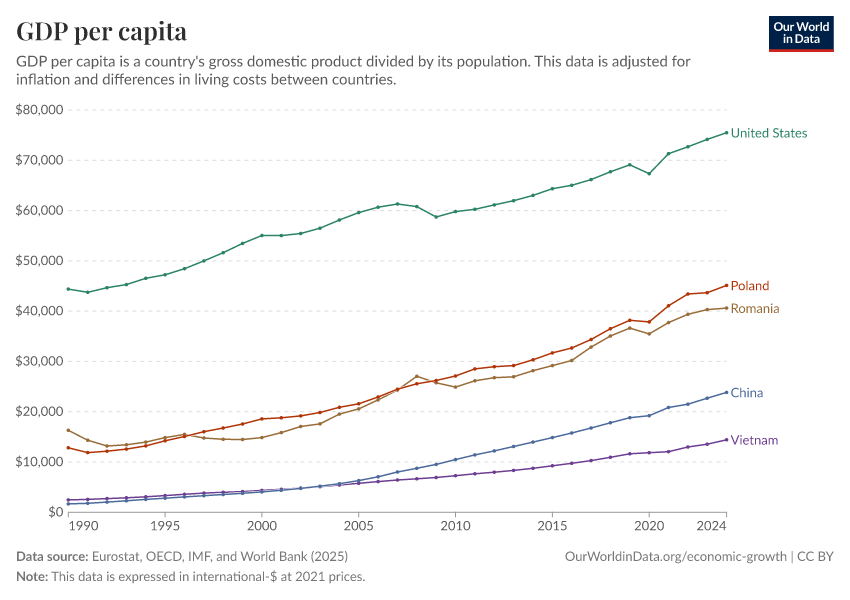 “Data Page: GDP per capita”, part of the following publication: Max Roser, Bertha Rohenkohl, Pablo Arriagada, Joe Hasell, Hannah Ritchie, and Esteban Ortiz-Ospina (2023) - “Economic Growth”. Data adapted from Eurostat, OECD, IMF, and World Bank. Retrieved from https://archive.ourworldindata.org/20260112-111535/grapher/gdp-per-capita-worldbank.html [online resource] (archived on January 12, 2026).How to cite this data