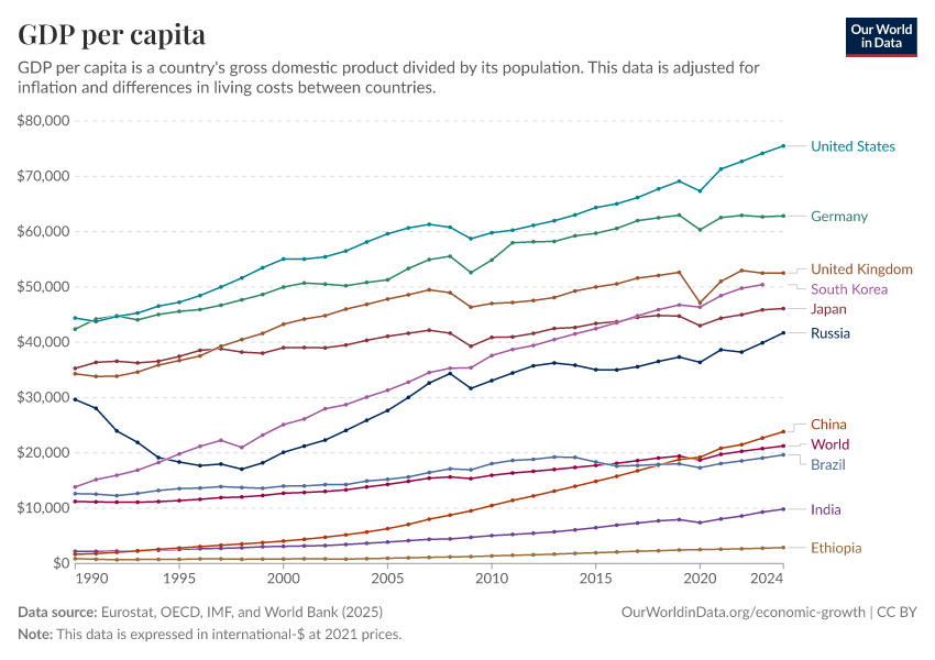 “Data Page: GDP per capita”, part of the following publication: Max Roser, Bertha Rohenkohl, Pablo Arriagada, Joe Hasell, Hannah Ritchie, and Esteban Ortiz-Ospina (2023) - “Economic Growth”. Data adapted from Eurostat, OECD, IMF, and World Bank. Retrieved from https://archive.ourworldindata.org/20260112-111535/grapher/gdp-per-capita-worldbank.html [online resource] (archived on January 12, 2026).How to cite this data