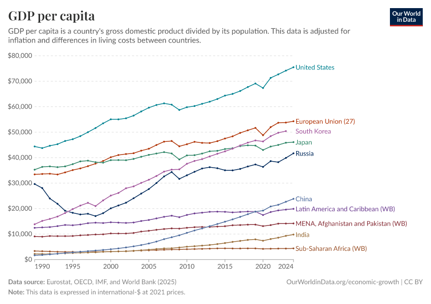 Eurostat, OECD, IMF, and World Bank (2025) – with minor processing by Our World in Data. “GDP per capita – World Bank – In constant international-$” [dataset]. Eurostat, OECD, IMF, and World Bank, “World Development Indicators 122” [original data]. Retrieved December 17, 2025 from https://archive.ourworldindata.org/20251209-133038/grapher/gdp-per-capita-worldbank.html (archived on December 9, 2025).