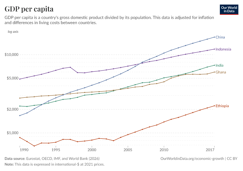 - This data comes from the World Bank and starts in 1990. For estimates going back several centuries, explore our chart of GDP per capita from the Maddison Project Database.