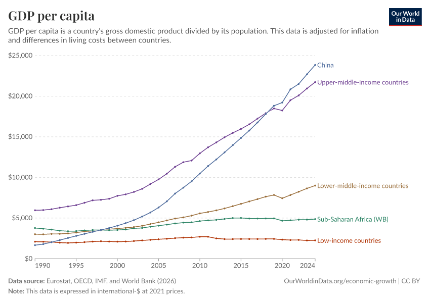 “Data Page: GDP per capita”, part of the following publication: Max Roser, Bertha Rohenkohl, Pablo Arriagada, Joe Hasell, Hannah Ritchie, and Esteban Ortiz-Ospina (2023) - “Economic Growth”. Data adapted from Eurostat, OECD, IMF, and World Bank. Retrieved from https://archive.ourworldindata.org/20251017-101247/grapher/gdp-per-capita-worldbank.html [online resource] (archived on October 17, 2025).How to cite this data