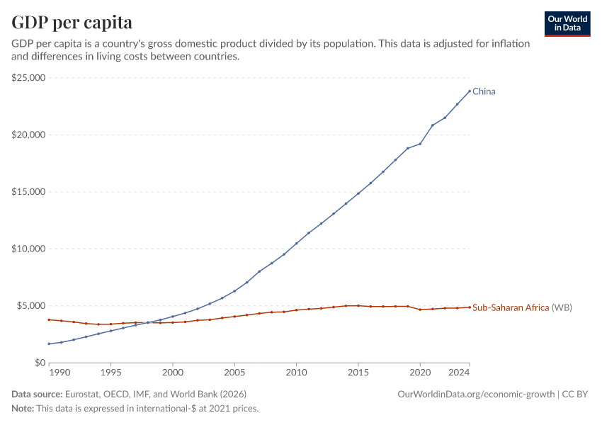 “Data Page: GDP per capita”, part of the following publication: Max Roser, Bertha Rohenkohl, Pablo Arriagada, Joe Hasell, Hannah Ritchie, and Esteban Ortiz-Ospina (2023) - “Economic Growth”. Data adapted from Eurostat, OECD, IMF, and World Bank. Retrieved from https://archive.ourworldindata.org/20260202-180243/grapher/gdp-per-capita-worldbank.html [online resource] (archived on February 2, 2026).How to cite this data