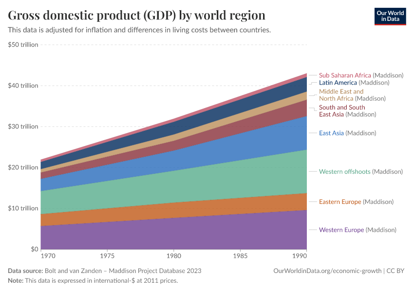 “Data Page: Gross domestic product (GDP)”, part of the following publication: Max Roser, Bertha Rohenkohl, Pablo Arriagada, Joe Hasell, Hannah Ritchie, and Esteban Ortiz-Ospina (2023) - “Economic Growth”. Data adapted from Bolt and van Zanden. Retrieved from https://archive.ourworldindata.org/20260410-215714/grapher/gdp-world-regions-stacked-area.html [online resource] (archived on April 10, 2026).How to cite this data