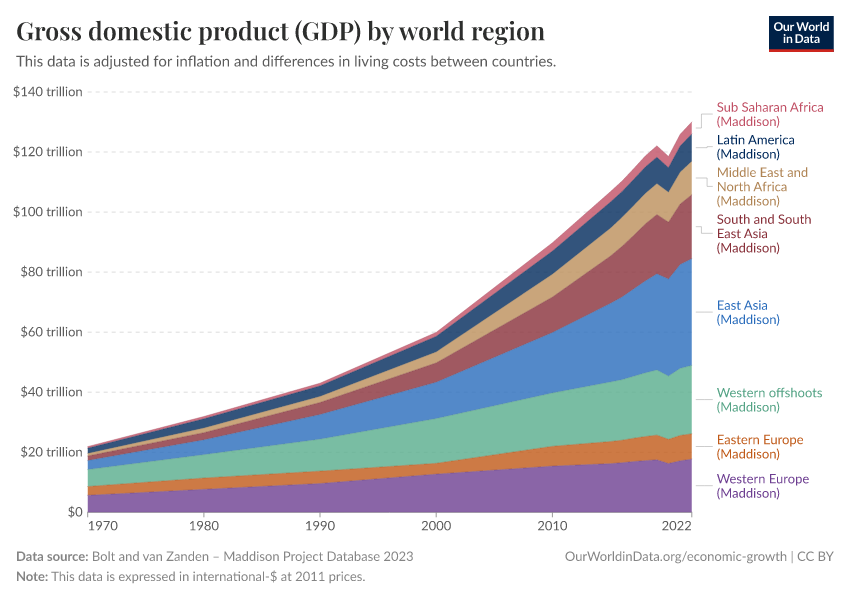 “Data Page: Gross domestic product (GDP)”, part of the following publication: Max Roser, Bertha Rohenkohl, Pablo Arriagada, Joe Hasell, Hannah Ritchie, and Esteban Ortiz-Ospina (2023) - “Economic Growth”. Data adapted from Bolt and van Zanden. Retrieved from https://archive.ourworldindata.org/20251111-144738/grapher/gdp-world-regions-stacked-area.html [online resource] (archived on November 11, 2025).How to cite this data