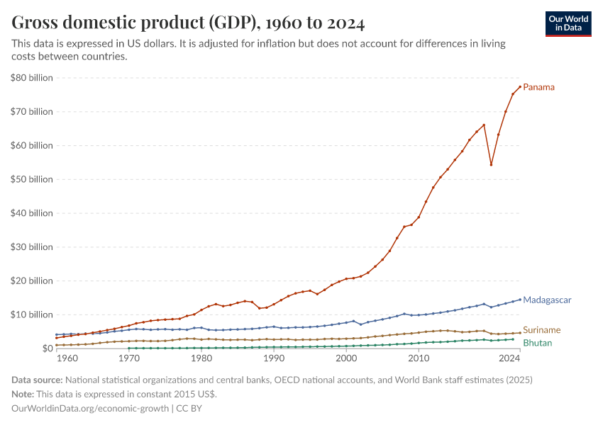 “Data Page: Gross domestic product (GDP)”, part of the following publication: Max Roser, Bertha Rohenkohl, Pablo Arriagada, Joe Hasell, Hannah Ritchie, and Esteban Ortiz-Ospina (2023) - “Economic Growth”. Data adapted from National statistical organizations and central banks, OECD national accounts, and World Bank staff estimates. Retrieved from https://archive.ourworldindata.org/20251220-152415/grapher/gdp-worldbank-constant-usd.html [online resource] (archived on December 20, 2025).How to cite this data