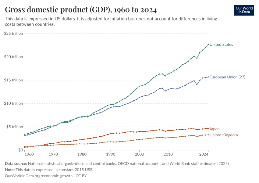 “Data Page: Gross domestic product (GDP)”, part of the following publication: Max Roser, Bertha Rohenkohl, Pablo Arriagada, Joe Hasell, Hannah Ritchie, and Esteban Ortiz-Ospina (2023) - “Economic Growth”. Data adapted from National statistical organizations and central banks, OECD national accounts, and World Bank staff estimates. Retrieved from https://archive.ourworldindata.org/20260112-111535/grapher/gdp-worldbank-constant-usd.html [online resource] (archived on January 12, 2026).