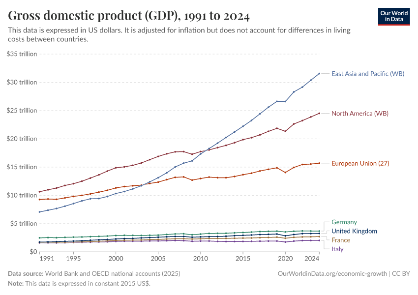 World Bank and OECD national accounts (2025) – with minor processing by Our World in Data. “Gross domestic product (GDP) – World Bank – In constant US$” [dataset]. World Bank and OECD national accounts, “World Development Indicators 122” [original data]. Retrieved December 8, 2025 from https://archive.ourworldindata.org/20251110-093020/grapher/gdp-worldbank-constant-usd.html (archived on November 10, 2025).