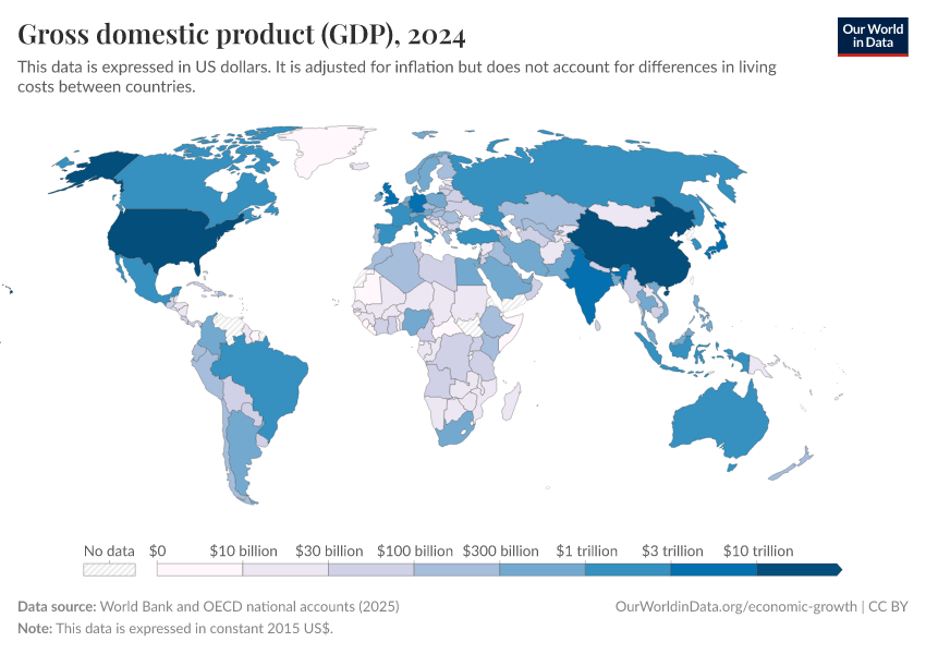 World Bank and OECD national accounts (2025) – with minor processing by Our World in Data. “Gross domestic product (GDP) – World Bank – In constant US$” [dataset]. World Bank and OECD national accounts, “World Development Indicators 122” [original data]. Retrieved December 19, 2025 from https://archive.ourworldindata.org/20251110-093020/grapher/gdp-worldbank-constant-usd.html (archived on November 10, 2025).